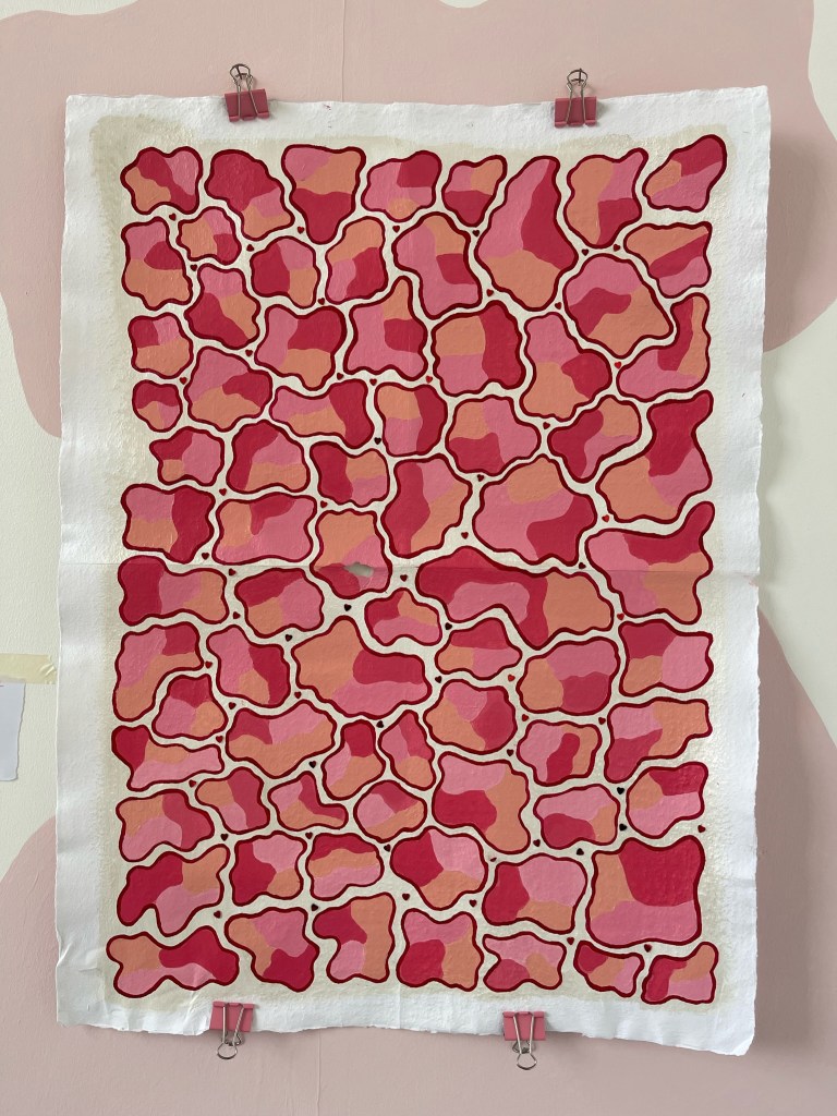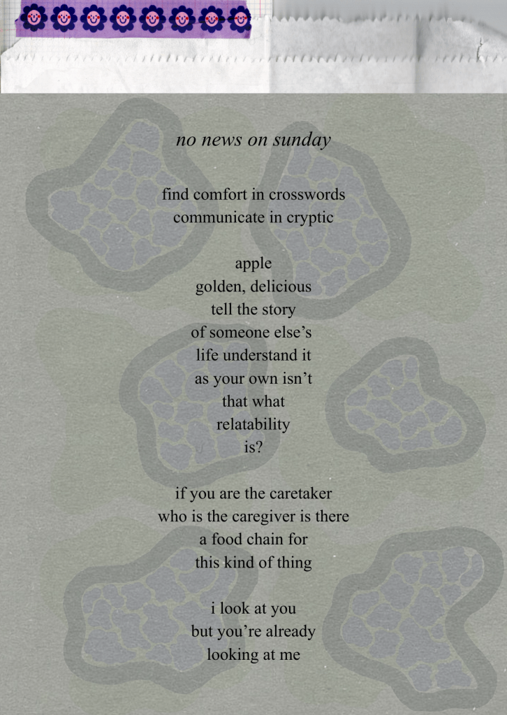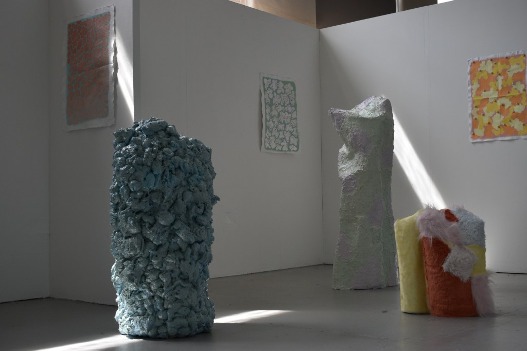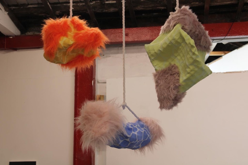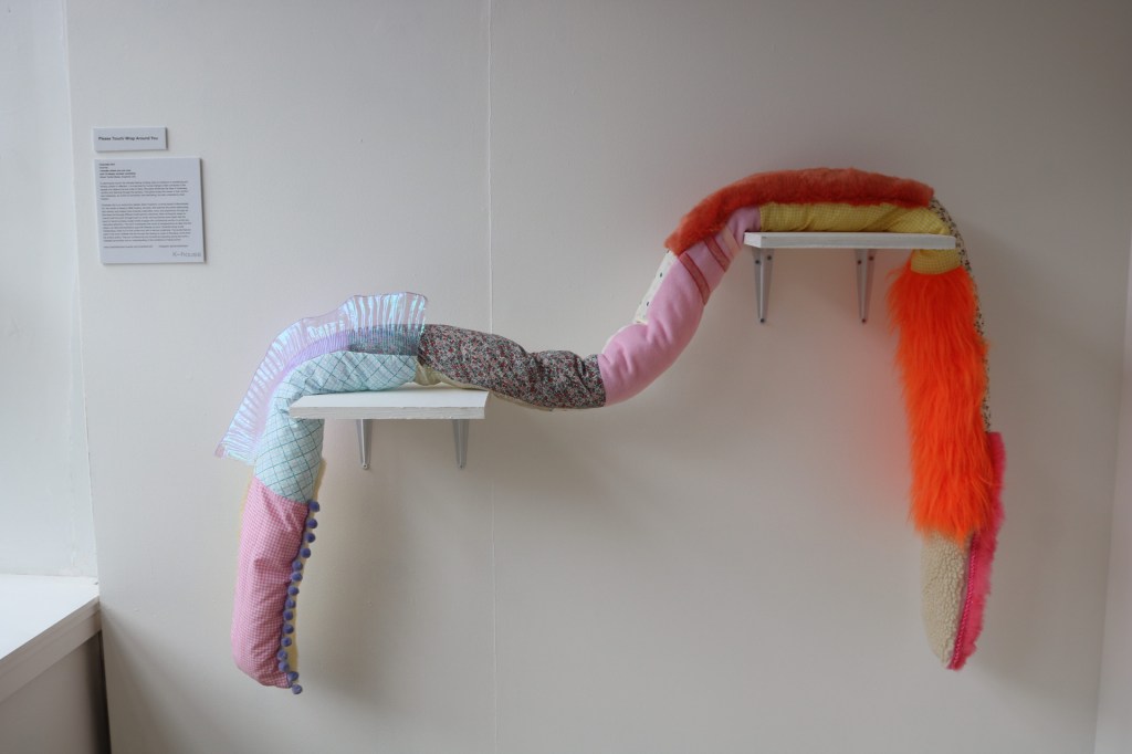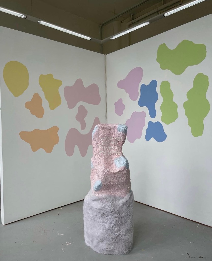 Through a contrast of inanity and reality, the human condition is recognised for its inconsistent and capricious nature. An examination into our relationship to artwork through different sensorial elements; the work often invites the viewer to interact through touch or smell. Soft saccharine tones clash with the touch of harsh textures, sweet smells engage with vulnerability in a sickly but inquisitive attraction. Writings are confessional and sometimes exposing, offering a hesitance to relatability and a dissonance conflicting the trivial and the childish. Compositional elements of painting create a set discourse between what can or cannot be controlled, through form and colour.